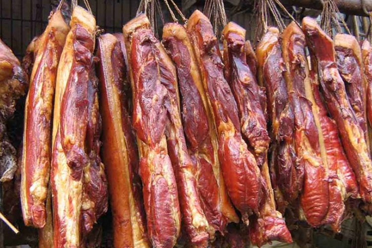 臘肉的選料和預(yù)處理:選用經(jīng)檢疫合格的新鮮或解凍豬的后腿肉,經(jīng)過剔骨處理,除去肥膘、筋膜,順著肌纖維切成塊,洗去油污。